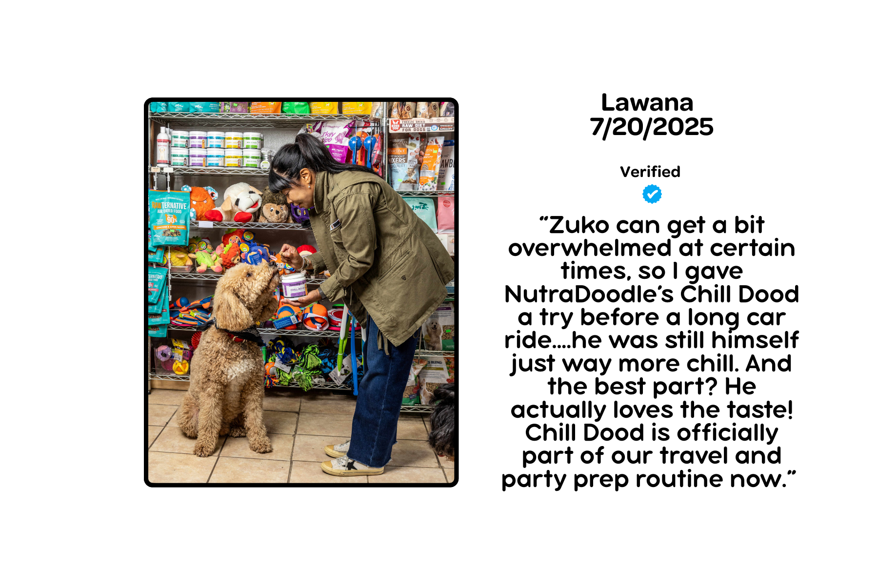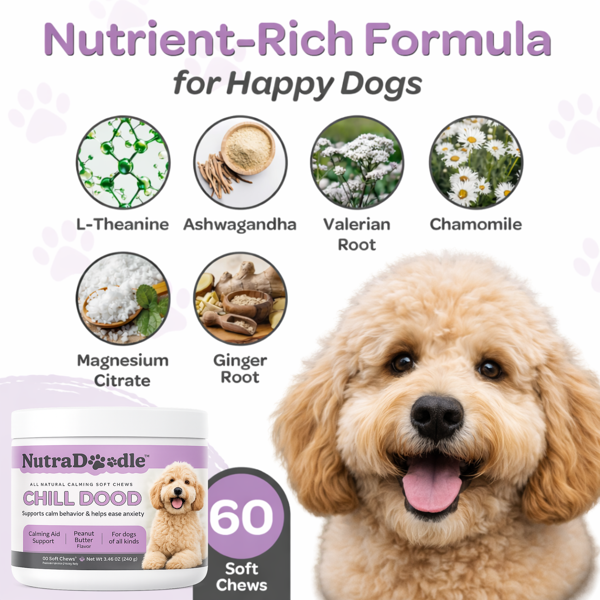 Help your dog stay relaxed and stress-free with our calming dog supplement - Chill Dood Soft Chews. Made with a powerful blend of L-Theanine, Ashwagandha, Magnesium Citrate, Valerian Root, and Chamomile, these chews promote relaxation, reduce anxiety, and support balanced behavior. Whether it’s separation anxiety, loud noises, or travel stress, this natural formula helps your pup feel calm and at ease—without drowsiness.