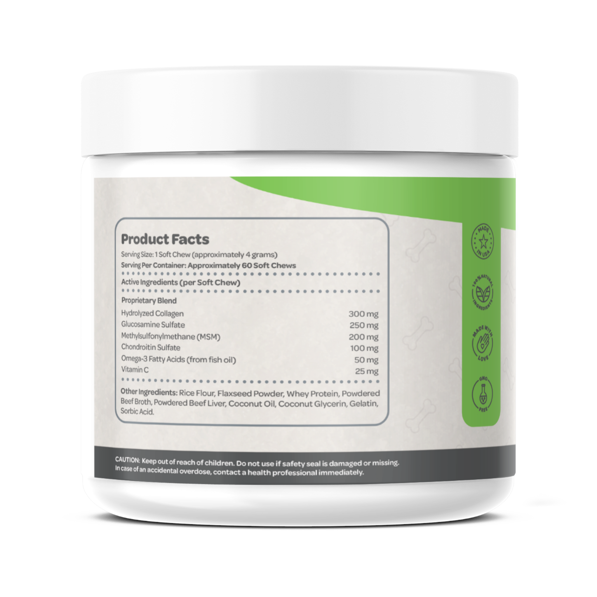 Support your dog's mobility and joint health with our premium Mobile Dood Soft Chews. Formulated with a powerful blend of Hydrolyzed Collagen, Glucosamine Sulfate, Chondroitin Sulfate, MSM, Omega-3 Fatty Acids, and Vitamin C, these soft chews provide advanced hip and joint support for dogs, including active, aging, and large-breed dogs. Designed for daily use, they support flexibility, help reduce discomfort, and promote long-term joint function—all in a delicious, easy-to-chew treat your dog will love.